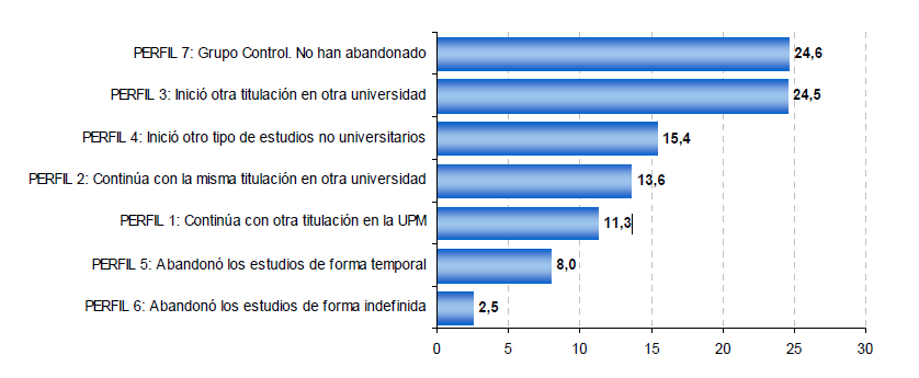 La distribución de los estudiantes encuestados según el tipo de perfil se muestra en la Figura 1. El perfil 7 se corresponde con el grupo de control de estudiantes que no han abandonado.