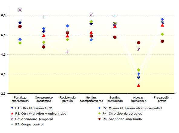 ACCIÓN: Dejar. Es un colectivo que no se identifica a sí mismo con el ámbito universitario. Las valoraciones de los factores vinculados directamente con las características de un estudiante universitario común, como son el compromiso académico y la resistencia a la presión, distan sustancialmente para este perfil de los niveles de los colectivos que siguen en el ámbito académico.