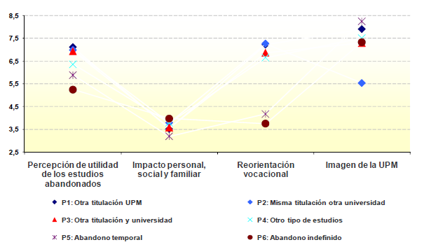 los seis perfiles de abandono. A continuación se destacan los aspectos más significativos, si bien gráficamente se pueden apreciar diferencias notables de valoración en una escala de 0 a 10.