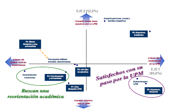 EJE 2: Percepción estudios UPM (12,2%). Representa el impacto personal, social y familiar enunciado de manera negativa. En este caso, se trata de una visión negativa asociada con la pérdida de tiempo y una mala experiencia vital. A pesar de que el perfil de abandono definitivo es el más cercano a este eje, tampoco se puede afirmar que disponga de un posicionamiento claro en el mismo.