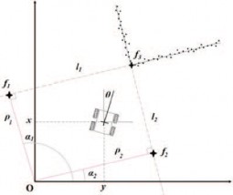 Se asume que el ambiente debe estar poblado de objetos que poseen características rectilíneas, por ejemplo, paredes, puertas, cajas, o estantes. El sensor de rango láser montado en el robot toma distancias desde su probable ubicación. Las lecturas son captadas en series de rangos y ángulos, de las cuales pueden ser extraídas características lineales, considerando un coeficiente de correlación lineal es aceptable. En [10] se detallan los algoritmos generales para la extracción de líneas a partir de las lecturas de un sensor de rango. Como puede observarse en la figura 1, el conjunto de líneas debe ser parametrizado de la forma 𝑙𝑖=[𝜌𝑖,𝛼𝑖], donde 𝜌𝑖 y 𝛼𝑖 representan respectivamente los rangos y ángulos de los segmentos de lineas que parten del origen global del mapa. Es necesario, entonces, obtener coordenadas globales a partir de coordenadas del robot. Entonces, también la representación del ambiente puede hacerse por medio de un conjunto de características 𝑓𝑖=[𝑥 𝑓𝑖,𝑦 𝑓𝑖]. Las posiciones de estas características son extraídas al punto de intersección de las líneas originales con las líneas normales desde el origen global, o, en el caso de las esquinas, de la intersección de las líneas originales [11].