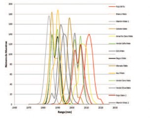 Figura 2. Cambios en la dispersión de acuerdo al color y brillo de la superficie para una distancia de 2000 mm.