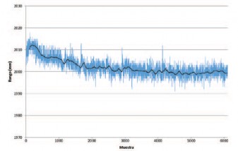 Durante los períodos de muestreo (cada 20000 lecturas), se dieron dos o tres lecturas con valores de entre 0 y 10 mm. Estas lecturas representan errores atípicos, fuera del rango mínimo del sensor (ver tabla 1), y fueron descartadas como mediciones válidas. Se atribuye este fenómeno a la saturación de la electrónica del receptor o del búfer de datos. Como no es posible modelar esta situación, dentro del programa se incorpora una función condicional para ignorar la lectura.