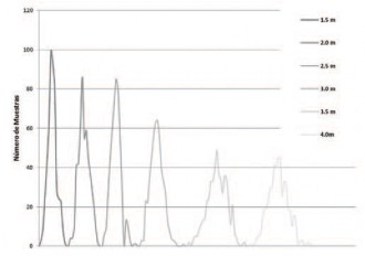 Este efecto no fue notado con todos los colores, solo con la muestra gris en particular. Quizás el fabricante reconoce este fenómeno, pues asegura que el error se mantendrá a 3% dentro de las distancias de operación (60-4,095mm). A medida que la distancia del objetivo aumenta, se puede ver que la distribución cambia dramáticamente. Para tener una idea del fenómeno, la diferencia entre la lectura mínima y la máxima para 1.5 m fue de 12, mientras que para la de 4.0 m fue de 30. Este fenómeno se puede apreciar en la figura 6. Se puede notar que el diámetro de la dispersión aumenta con la distancia, pero este fenómeno debería reflejarse también con otros colores.